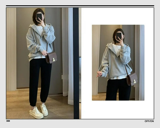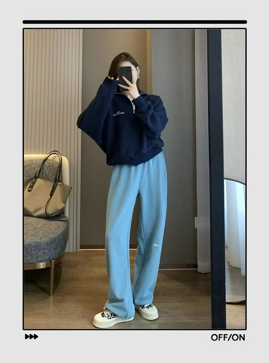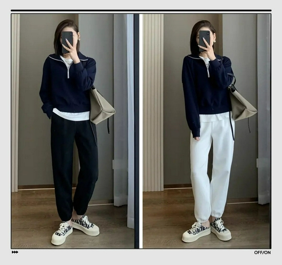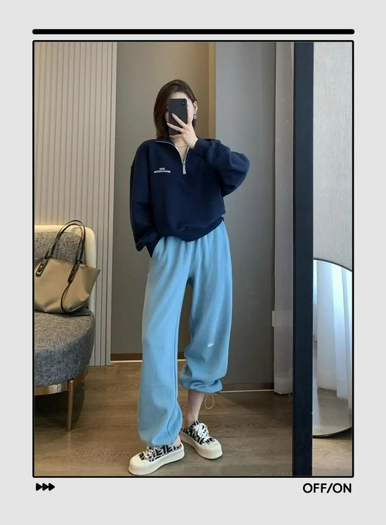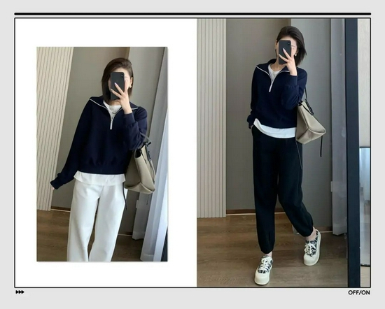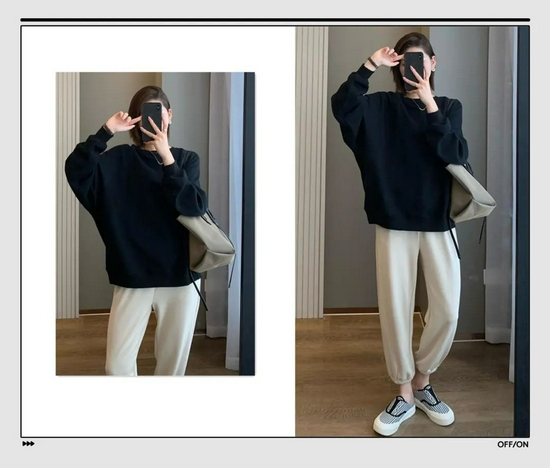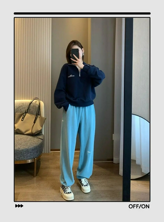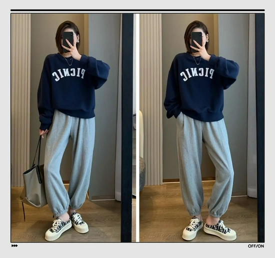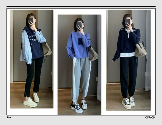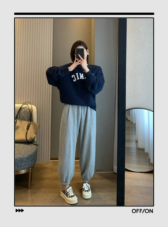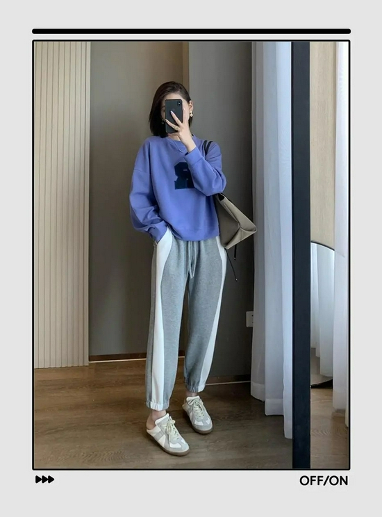 肯定有姐妹不想穿出五五分身材,推荐这种短款卫衣,再搭配一条高腰卫裤,稍微露出脚踝来,比例依旧优越。