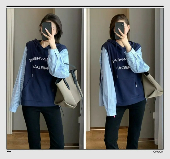 这是一款设计感爆棚的卫衣,非常有趣的撞色拼接,它非常适合秋季穿,我感觉只比T恤厚一点点。