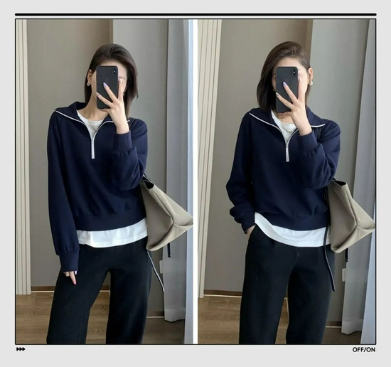 翻领卫衣最近悄悄地流行起来,落下拉链形成翻领,有一种正经沉稳的感觉,很显英气。天冷时拉链拉起,小高领还能保暖。