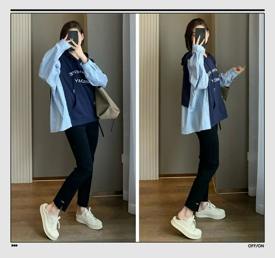 搭配一条小黑裤穿就足够时髦了,宽松的版型还有很强的包容度,不挑人。穿上身有一种衬衫叠穿卫衣的错觉。