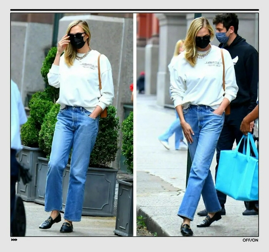 超模辣妈 Karlie Kloss身穿白色字母卫衣,下搭直筒牛仔裤,卫衣的一角塞腰,很有活力。