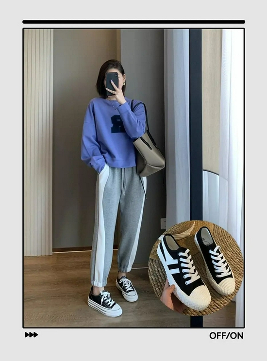 卫衣+卫裤的组合,再合适不过了。小个子女生穿时给大家一个小建议,将卫衣的一边衣角塞进卫裤里,为的是显出高腰来。