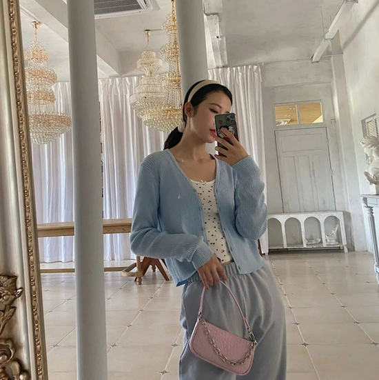 色系的呼应也绝对是时髦精们搭配时必须要考虑的,白色内搭、baby蓝针织衫、灰蓝色裤装与粉色腋下包组合在一起,低饱和度的色彩看上去特别温柔有木有?
