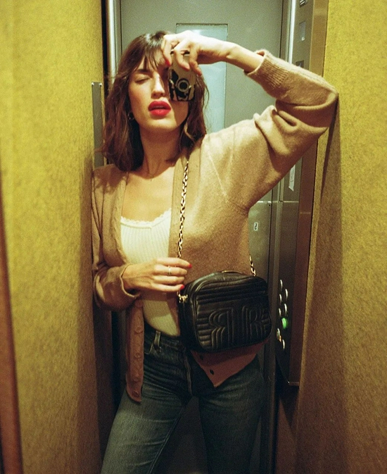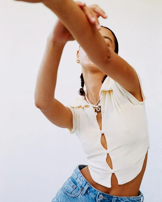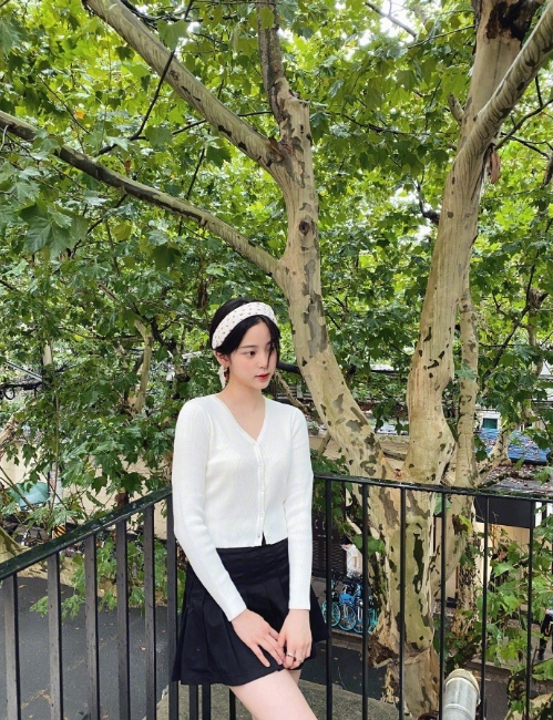 细针织的材质非常修身,系扣的穿法绝对是最凸显身材的方法,因此不妨再露出一点点小蛮腰,法式风那味儿是不是就有了?