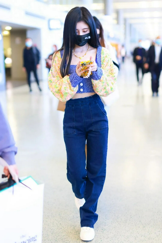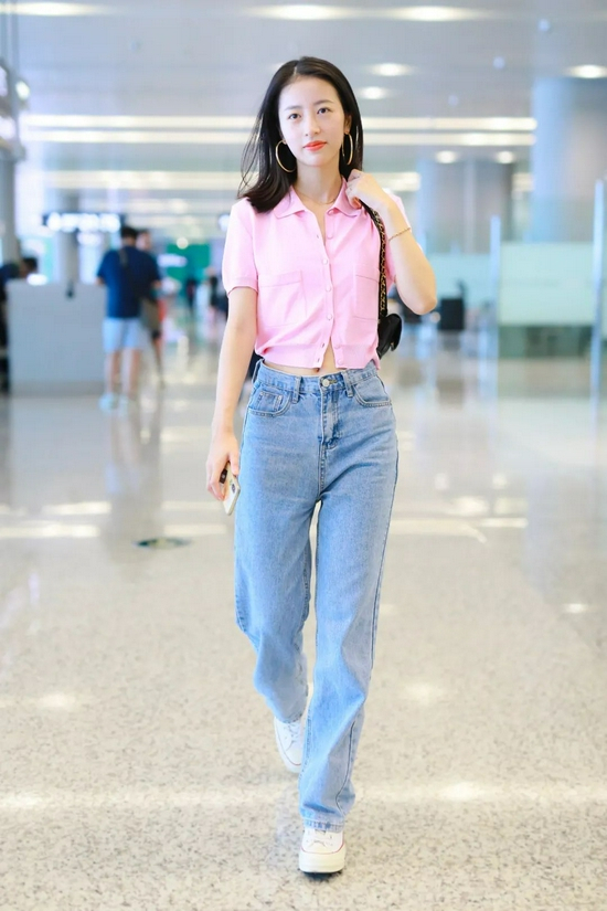 鞠婧祎的内搭短上衣很好的修饰了比例,搭配高腰牛仔裤瞬间就提升了视觉重心,身材娇小的女生也能拥有大长腿的说!