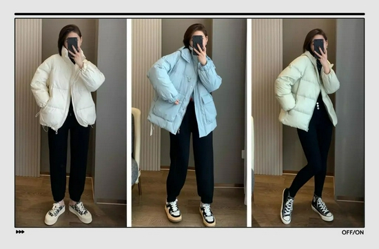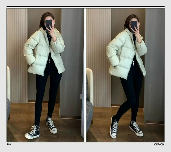 担心这种面包服显胖的话,可以试着“上宽下窄”搭条小黑裤。
