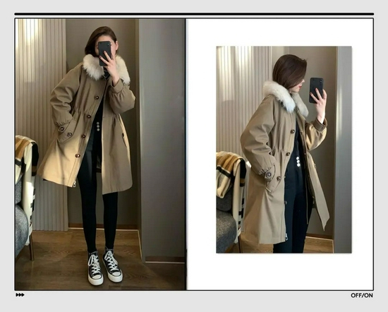 大大的毛领非常显女人味,也给你足够的温暖。在腰部有着抽绳的设计,显腰细的利器。