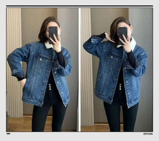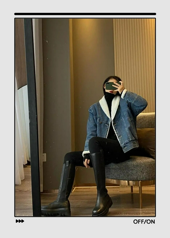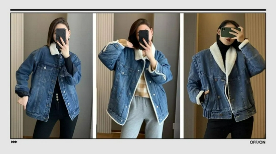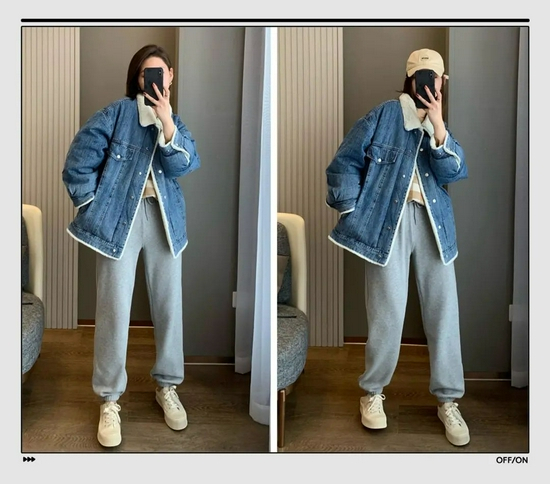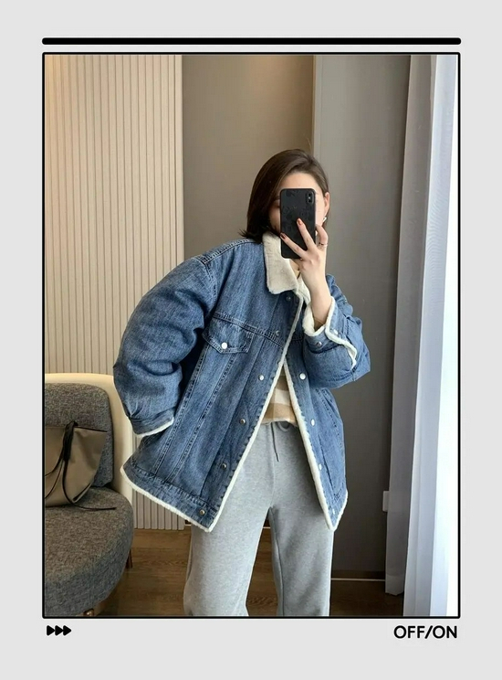 最后这件羊羔毛牛仔外套就有些中规中矩了,只有它的溜肩设计是一个亮点。但内里细腻的羊羔毛还是蛮厚实的,穿起来非常暖和。