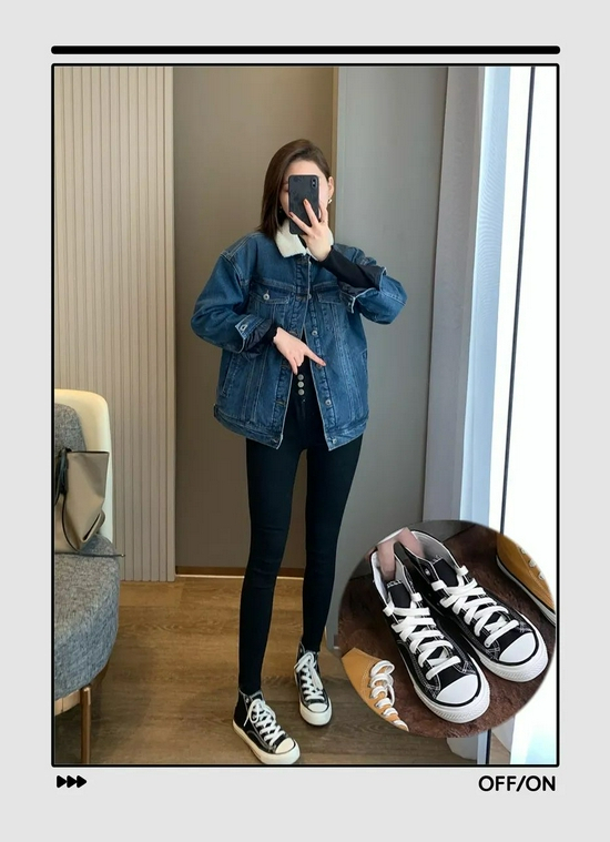到了冬天还是这种内里加绒的小黑裤最好穿,既能优化腿型还特别保暖。脚上穿一双高帮帆布鞋,非常显活力。