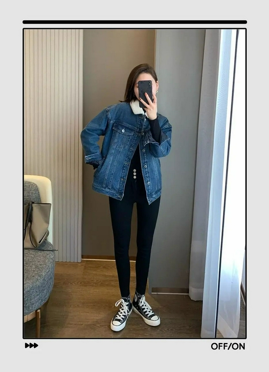 喜欢羊羔毛牛仔外套的小个子女生,可以看看这件,是短款设计的哦~搭配一条高腰小黑裤,瞬间就是“上短下长”的身材比例。