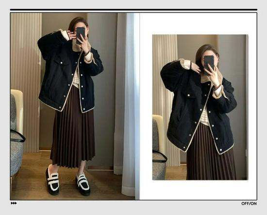 这件机车夹克是那种帅气中带着一点点可爱,版型还宽松的廓形,一点也不挑身材。外面加绒内里加棉,穿起来再也不怕降温了。