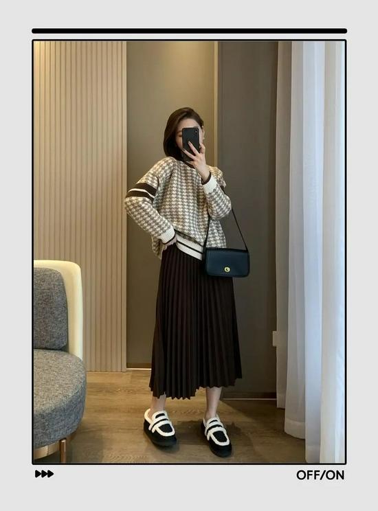 我选了一条百褶半身裙和这件千鸟格毛衣搭配,组成了“显瘦小能手”。尤其是对梨形身材的姐妹友好。脚上黑白两色的鞋子还和毛衣呼应了一下。