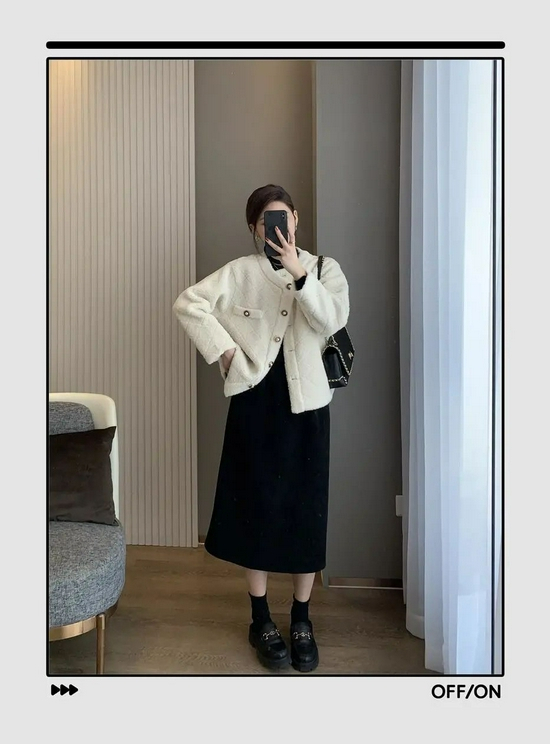 短外套与半身裙这对组合绝对是小个子女生的福音,“上短下长”的搭配让你瞬间显高5cm!