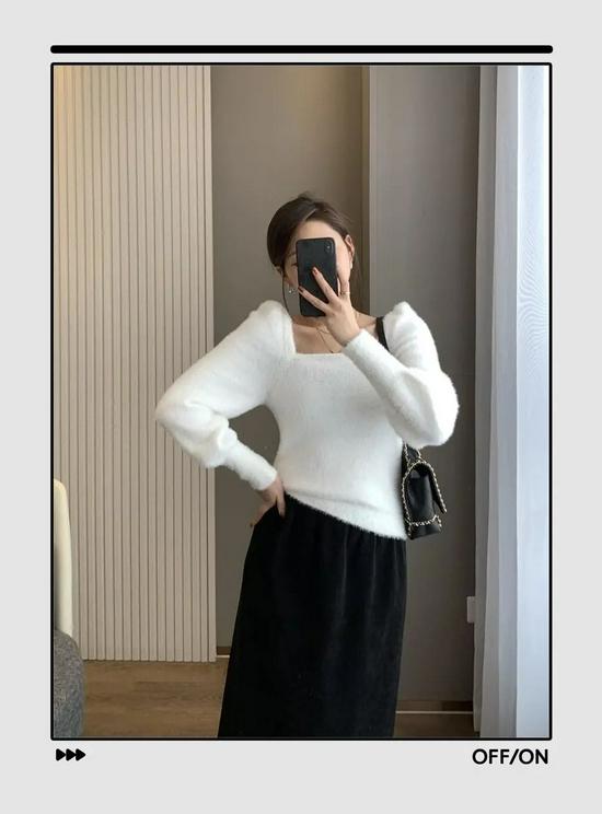 这种毛茸茸的毛衣穿起来既温暖又可以显可爱,穿上就不想脱下来。大大的方形衣领,展示出你纤细的锁骨,还有显脸小的效果。
