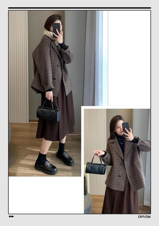 秋天的普通西装这个天气穿出门,肯定是找冻。还是看看毛呢面料的西装吧,搭配裙子既干练又不失万种风情。