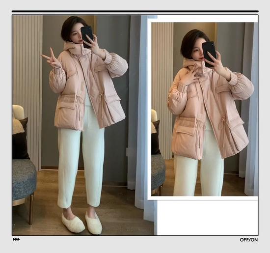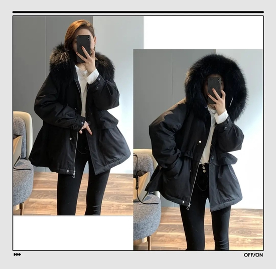 带有大毛领的派克羽绒服,穿出的臃肿感同样不容忽视。赶紧搭上一条黑色紧身裤。羽绒服有收腰绳的可一定要用上。