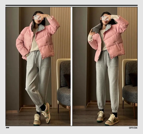 面包羽绒服搭配宽松卫裤,利落轻松,适合各种身材的女生,把卫裤提高点,小个子女生也不用担心面包服压身高了。