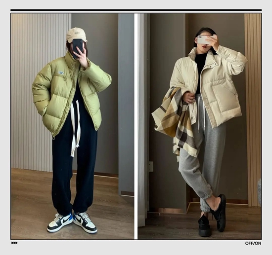 每个人都会有身材焦虑,所以穿羽绒服时总会顾虑重重。不如试试“运动休闲风”,用羽绒服搭配运动单品,不仅穿着舒服,还能快速出门。