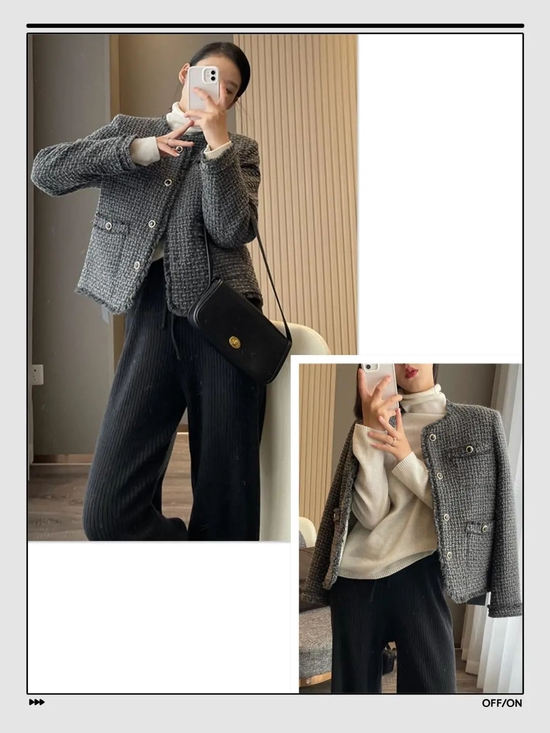 它外表看起来像是小香风外套,实际上内里填充了羽绒服,真正做到了保暖还不显臃肿。