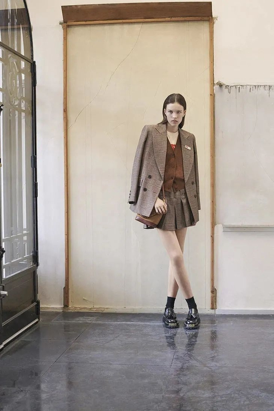 卡其色也经常出现在学院风穿搭中。这种中性的颜色低调含蓄,带着浅浅的书卷气。Miu Miu 春夏系列运用了大量的卡其色,并且版型回归经典,选择了干净简单的白衬衫与毛衣相配,都是值得入手的新季单品。