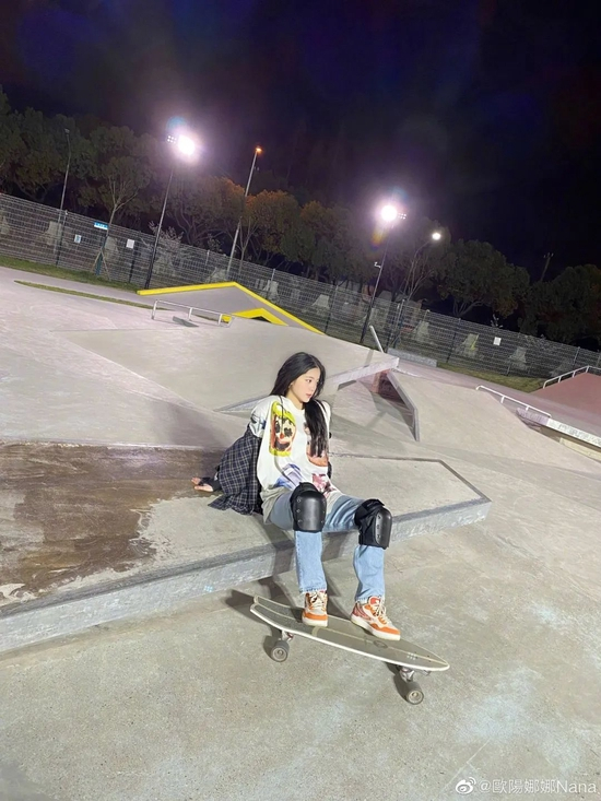 当然,光是泡健身房还不够,还有些女明星也在不断开发自己的运动领域,比如欧阳娜娜这段时间就迷上了滑板。