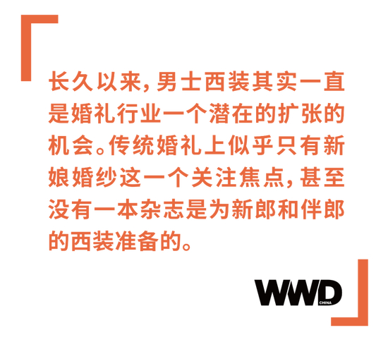 值得注意的是,长久以来,男士西装其实一直是婚礼行业一个潜在的扩张的机会。传统婚礼上似乎只有新娘婚纱这一个关注焦点,甚至没有一本杂志是为新郎和伴郎的西装准备的。曾经人们为了表达个性化为西装定制彩色的内衬,或者和伴郎团队一起遵循一种配色方案。