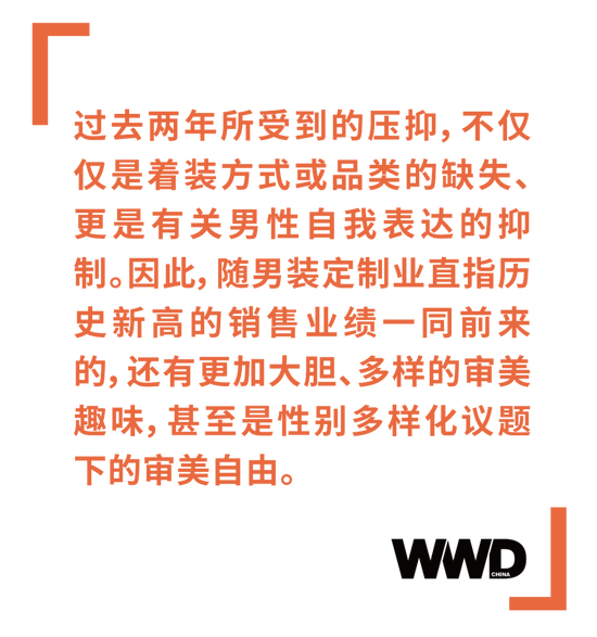 与此同时,正如 Fokke de Jong 所提到的“压抑效应” ,男装定制业务在过去两年所受到的压抑,不仅仅是一种着装方式或品类的缺失、更是对男性自我表达的抑制。因此,随着男装定制业务直指历史新高的销售业绩一同前来的,还有更加大胆多变的审美趣味,甚至是基于性别多样性议题下的审美自由。