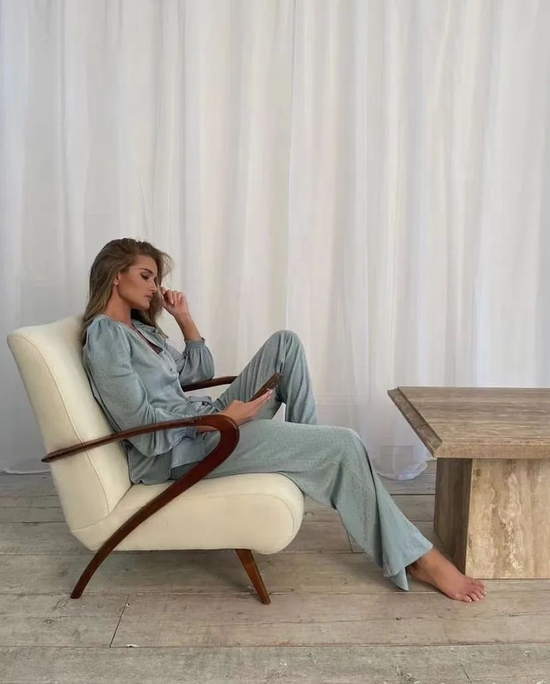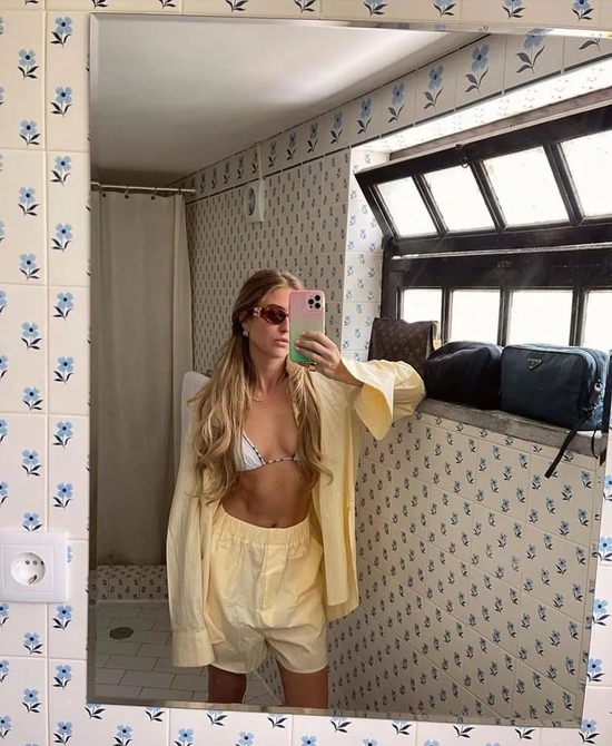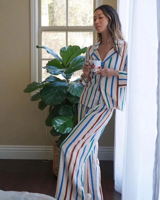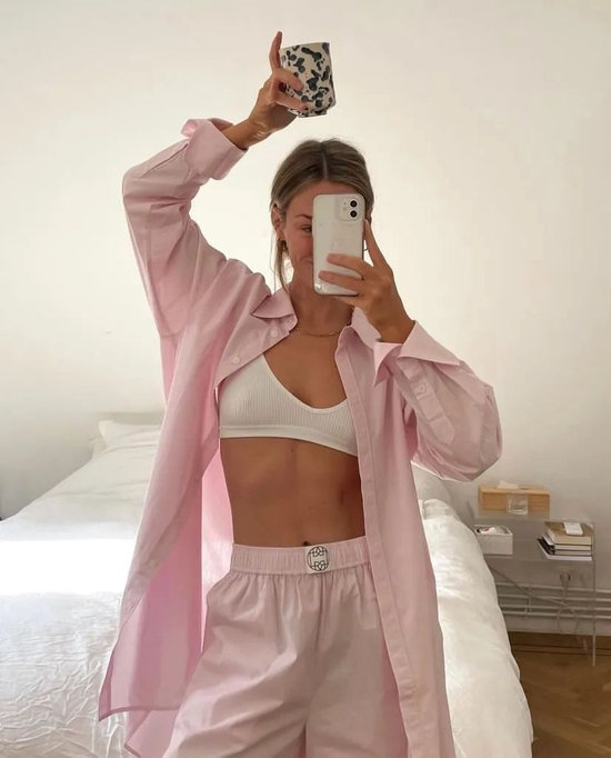 这种彩色的衬衫套装也是今年很🔥的居家风,里面的内衣怎么有趣怎么搭,反正上相就行。