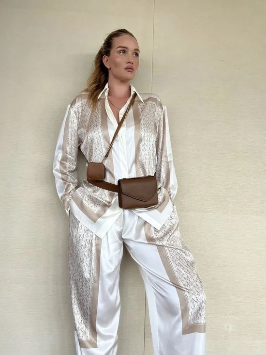 Rosie在棕白色调的居家服里面搭了棕色的内衣,低扣时不经意露出一点点小性感的玩法,好学。