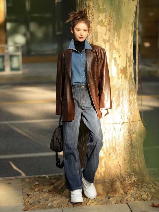 大地色和牛仔蓝的关系好到,都大面积地放在上半身也能和谐相处。而且两个颜色都属于有些沉淀感的,放在一起,有了浓烈的复古腔调。