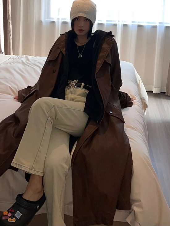 周雨彤这套搭配更是深得“时髦心”,深大地色的皮革大衣里裹着条白色长裤,一下子就柔软细腻起来了。色调也是过分的好看,从帽子到鞋子的节奏都很舒服,发挥了有态度的穿搭美学。