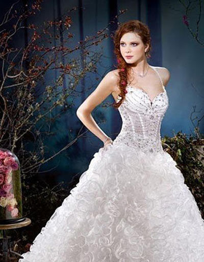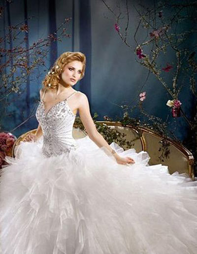 吊带婚纱吊带婚纱,婚纱上半身的碎钻呈放射性分布,很有古典的味道。婚纱上下的搭配,一收一放,感觉像是古代宫殿的女王一般!