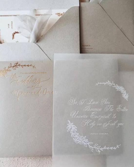 不喜欢太过花俏的新人,可利用灰色、米色或白色调,结合上金色印刷,以及边缘手撕效果,就能呈现出一种看似随性,但却别有用心的典雅。(但使用简约设计卡片时,内文就会变得格外重要。)
