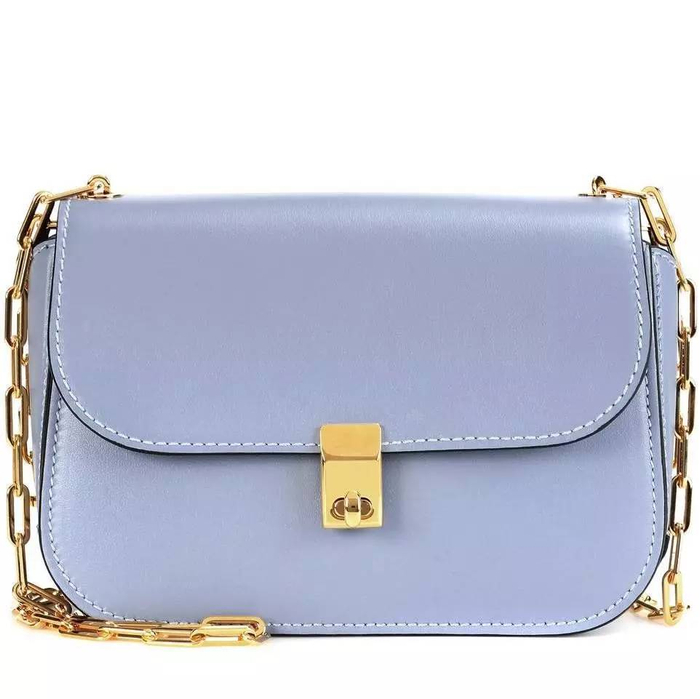 包型比较保守,算是中中规中矩的类型,而越是这样的款式恰好越不容易过时。包包的色彩比较特别,搭配金属色的链条感觉很适合都市白领日常上班的时候用。