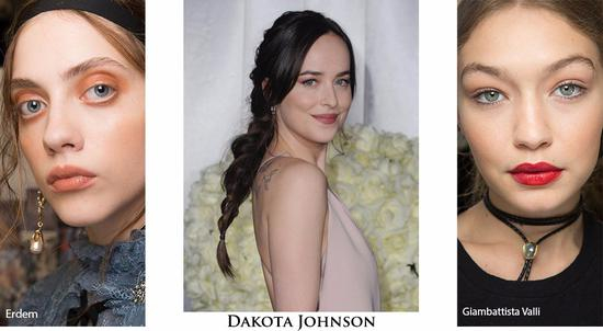 去年的时候当大家还沉浸在蓝绿色眼影的时髦时,今年流行的温暖的橙、棕红色调显得更为实用,其实日韩系女生一直都喜欢这种色系的妆容,非常柔和好驾驭,也更适合亚洲女生的轮廓。把棕红色做唇妆,橙色(橙色混合棕红色调配成棕铜色)做瘦脸腮红,并晕染在上眼睑超双眼皮折痕约1/3处做眼影,这个色系的脸部妆容基本不会出什么错,还能塑造出一个很自然地轮廓,而且很日常不显浮夸。或者,你也可以重新组合,调换颜色。