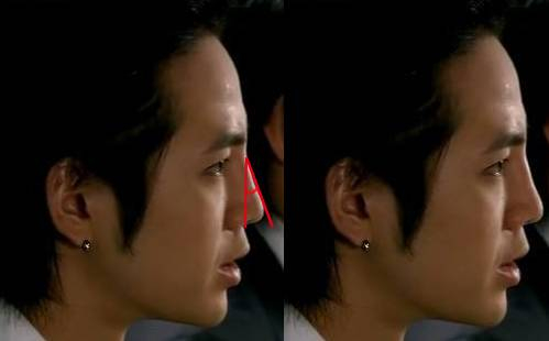 张根硕的算是让人诟病已久了,就以他为例,他的鼻尖好像是离脸挺远的,但是怎么看都说不上高挑,就是因为他山根太高,鼻子起点太高,鼻梁倾斜度就太小了。