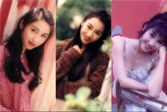 八九十年代流行的柔光影楼照,遮不住她明眸善睐的美。即使穿着低胸背心裙,也不让人觉得俗艳。