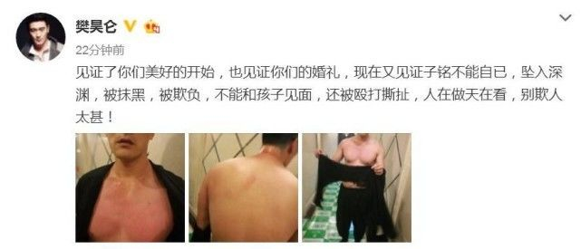 9月25日深夜,樊昊仑在微博上曝出好友赫子铭一组遭家暴受伤的照片,并配文“见证了你们美好的开始,也见证你们的婚礼,现在又见证子铭不能自已,坠入深渊,被抹黑,被欺负,不能和孩子见面,还被殴打撕扯,人在做天在看,别欺人太甚!”