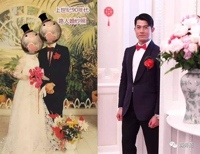 然而,郭富城迎亲这件胸口别着大红花的新郎服,范主看见第一眼就觉得巨有年代感。随手搜了一下上世纪90年代普通人拍的婚纱照,新郎打扮几乎一模一样→_→