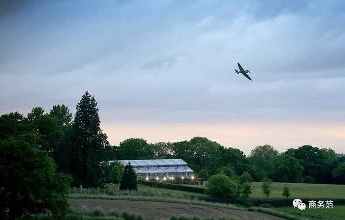 客人可以在玻璃屋里抬头观看飞机飞行表演。