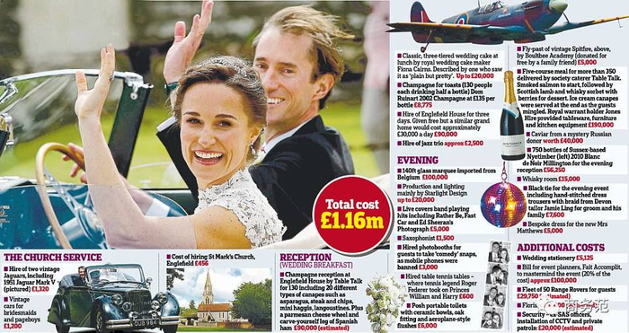 据DailyMail报道,Pippa和马修的婚礼,大约花了120万英镑,人民币将近1079.3万元。