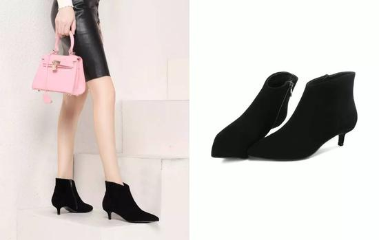 尖头及踝靴的鞋面设计成V型,既可以拉伸腿部线条,也会让整体造型更加高级精致;及踝靴的长度较短,可以更好的展露全腿,又能遮盖住较宽的踝骨,让双腿更加细长。