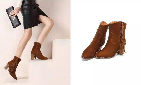 腿比较肉肉的女生穿不对靴子就会看起来头重脚轻,适合秋冬的颜色和流苏视觉上加重脚部的分量感,比例搭配协调显腿细。粗跟的设计即便是在冬季也超级好走;靴长延伸在脚踝上一些的位置,短靴的敞口没有过于的紧绷,让腿的比例看起来更美更瘦。