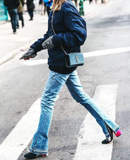 在裤脚的一侧或是中缝位置开衩是最新一季的流行趋势,这种剪裁设计在直筒、小脚、以及喇叭裤上都有应用,而且你还可以把那些衣柜里那些中规中矩的传统牛仔裤来个DIY,瞬间变时髦起来。