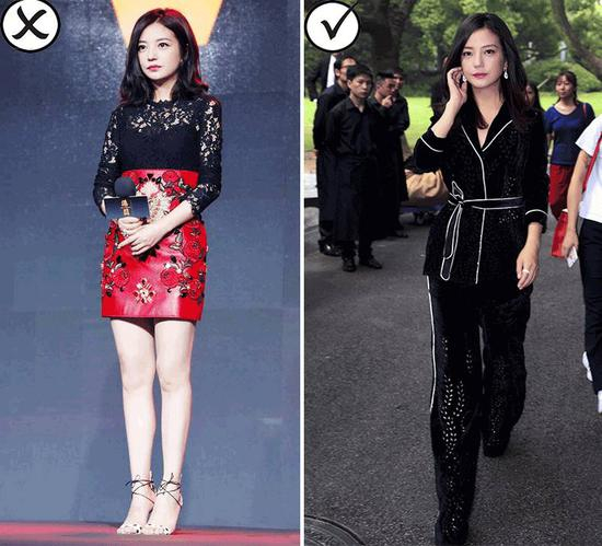 赵薇右图的宽松纯黑色上衣就比左图紧身透视装看上去要好很多。