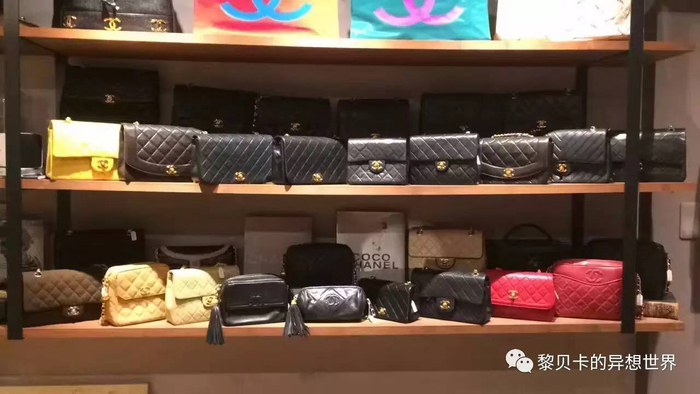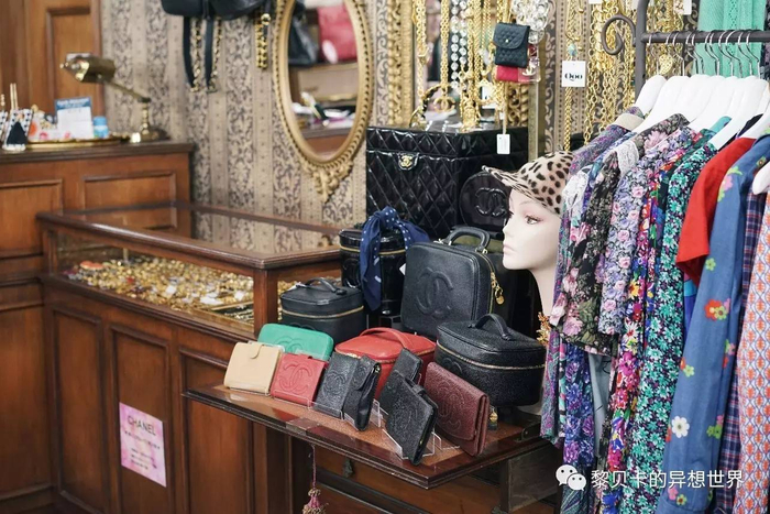 看这个标志就知道,她家主打卖的是Chanel 的古着。店里面积不大,靠墙的那面几乎全是Chanel。