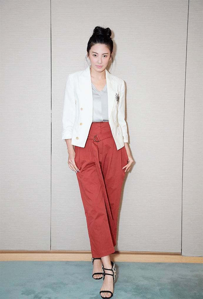 张雨绮收起了性感也可以瞬间穿出中性风,一件改良的西装外套让她看起来利落干练,高腰的 Paper Bag Pants 很好的遮盖了下半身的曲线,让腰部看起来更加纤细,上装塞入腰间,也让她的上半身看起来娇小了不少。