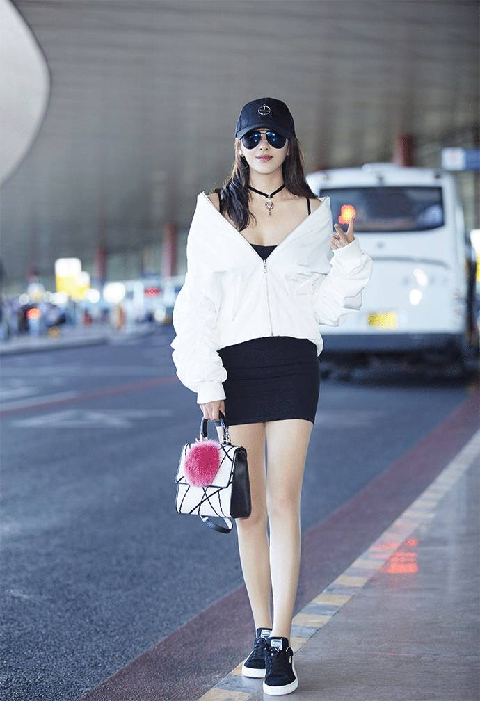 张雨绮紧致的肩膀比一般娇小型身材更能展示出一字肩穿法的魅力。她身穿DAMMY MA-1 飞行员夹克,内搭黑色吊带短裙,脚踩 PUMA Suede 系列运动鞋。整身搭配看起来运动感十足,却散发着无穷的女人性感魅力,丰满的上半身点缀吸睛的配饰,让人目不暇接。