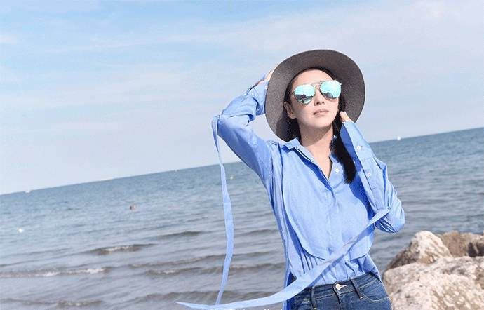 身着 Ellery 蓝色圆领褶边衬衫的张雨绮,利用飘带元素将视觉注意力分散,搭配的 Maison Michel 灰色礼帽同样有着相同作用,大量的细节可以让人们的视线并不总是集中于你的身材,再来一副帅气的 Gentle Monster 墨镜,这身随性的衬衫牛仔裤搭配完成!