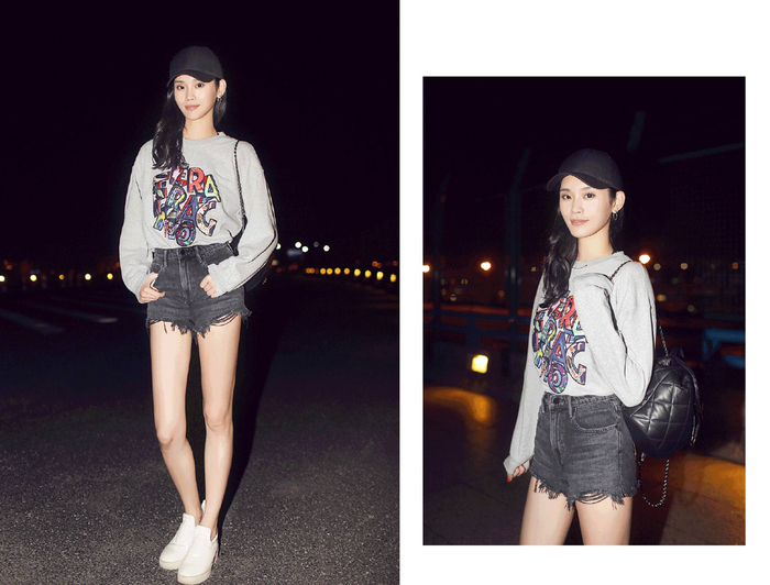 高腰的牛仔热裤超显腿长,有微微弧度的裤边腿长简直两米。